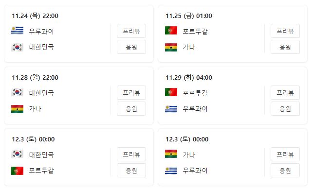 2022년 카타르 월드컵에서 우리 대한민국은 H조에 조편성이 되었고 포르투갈, 우루과이, 가나와 함께 같은 조에 배정되었습니다. H조에서 대한민국 경기는 이렇게 진행됩니다.