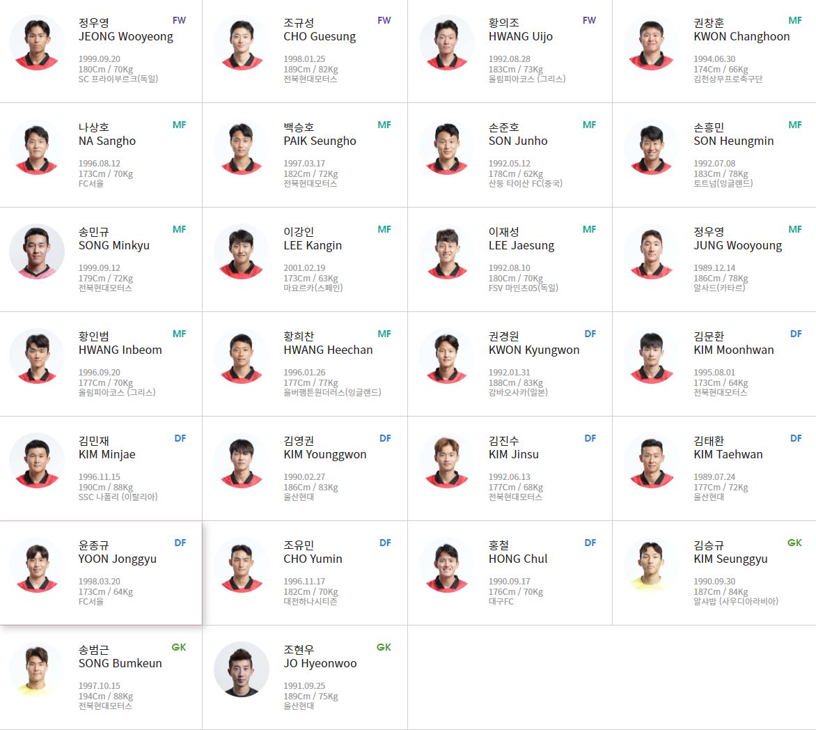 권경원, 김문환, 김민재, 김영권, 김진수, 김태환, 윤종규, 조유민, 홍철 - GK