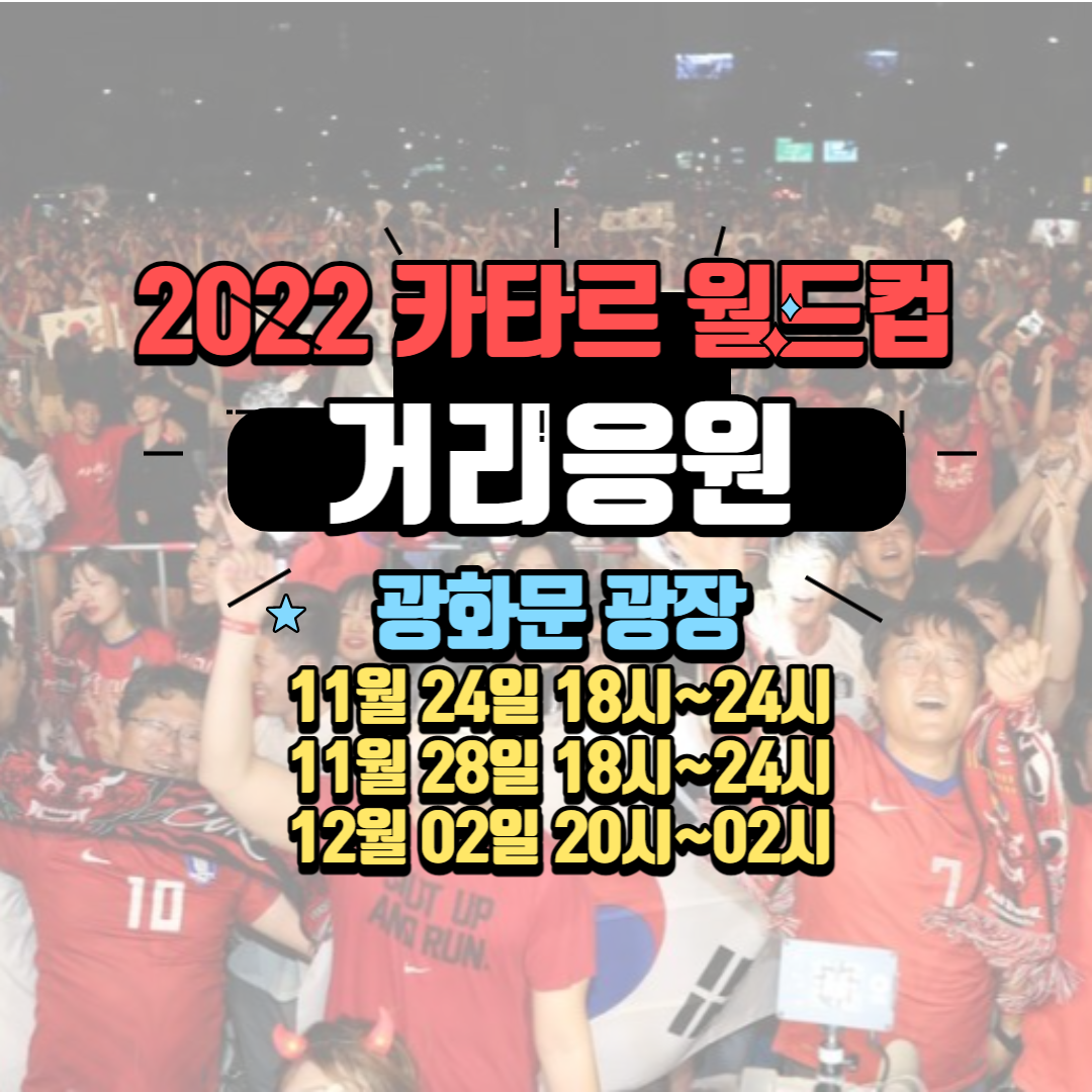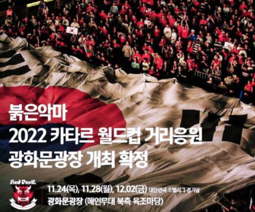 이태원 참사, 코로나19 여파로 불투명하던 2022 카타르 월드컵의 거리응원이 광화문 광장에서 열리게 되었습니다. 서울시는 붉은 악마 응원단이 제출한 광화문 광장에 대한 사용 신청을 11월 22일 광화문 광장 자문단의 심의를 거쳐 조건부 허가했습니다. 서울특별시는 허가 조건으로 원활한 동선 관리, 야간 시간대 안전 확보, 비상 상황 발생 시 신속 대응, 자문단 자문 결과 준수를 내세웠습니다.