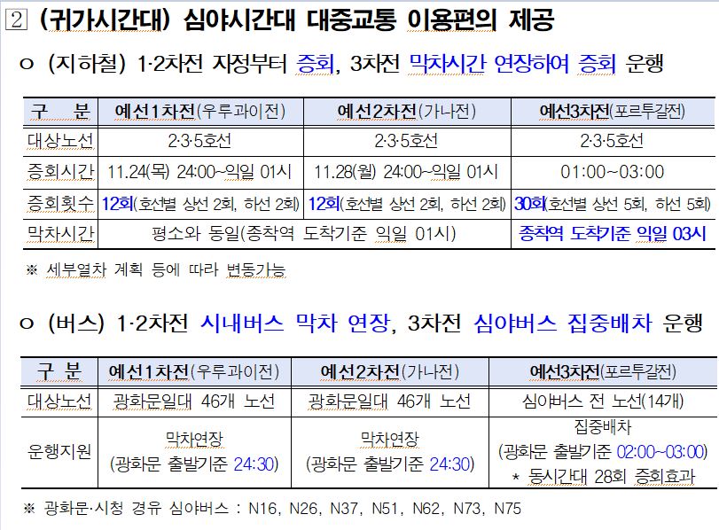 조별리그 1, 2차전에는 지하철 2, 3, 5호선을 24시~익일 01시, 상하선 각 2회씩 총 12회 증회 운영하며, 광화문 경유 46개 시내버스 노선의 막차시간을 광화문 출발 기준 24:30으로 연장합니다. 특히 새벽 02:00에 종료되는 조별리그 3차전에는 지하철 2, 3, 5호선 막차 시간을 익일 03시까지 연장하고 01~03시 상하선 각 5회씩 총 30회 증회 운영, 심야버스 전 노선을 02~03시 집중 배차할 계획이라고 합니다.