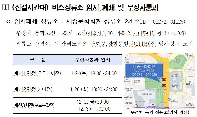 카타르 월드컵 조별리그 거리응원이 진행되는 동안 응원전에 나서는 시민들로 거리가 혼잡할 수 있어 행사 종료 시까지 광화문광장과 가장 인접한 세종문화회관 정류소(ID : 01272, 01126)는 안전을 위해 임시 폐쇄하고, 해당 정류소를 경유하는 버스 노선은 모두 무정차 통과할 예정입니다. 또한 지하철 5호선도 광화문역의 승강장 혼잡 수준을 모니터링하여 필요시 무정차 통과할 수도 있습니다.