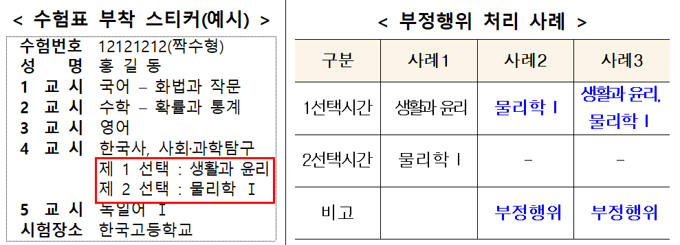 예를 들어, 제1 선택 과목 시간인데 제2 선택 과목 문제지를 책상에 올려두거나 푸는 경우, 혹은 1, 2과목 문제지를 동시에 책상에 올려놓는 경우 부정행위로 처리된다.